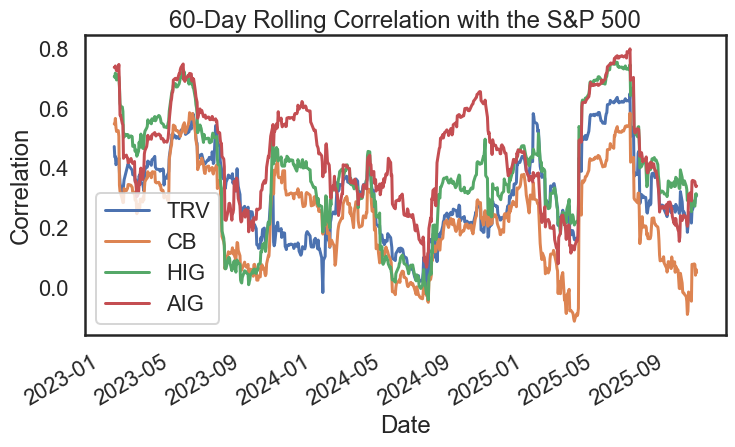 - Insurer correlations with the S&P 500 sit well below their cross-insurer ties, underscoring sector-specific dynamics.
