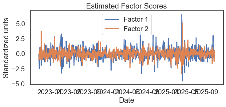 A two-factor model summarizes the latent forces driving the return co-movements. Scaling the data before fitting keeps the components comparable across tickers.