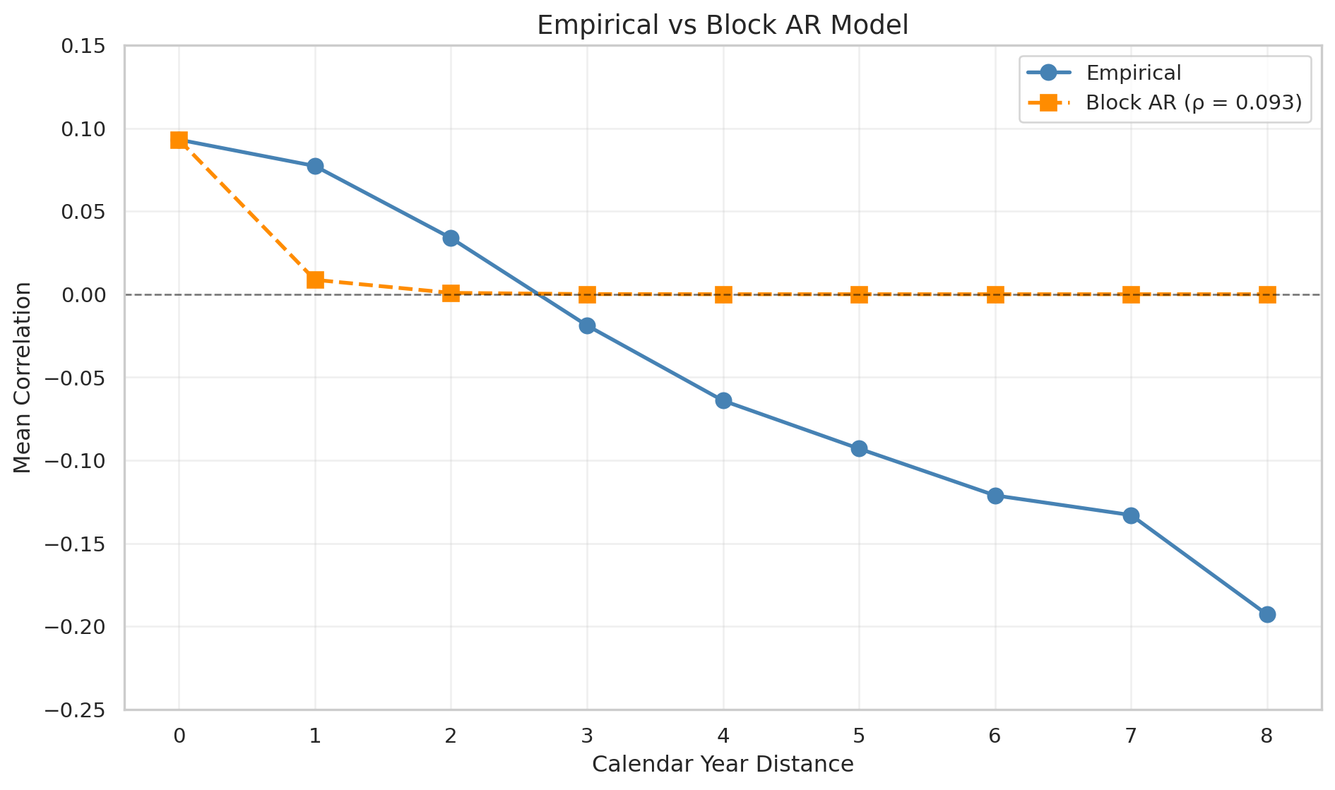 Simple block AR structures may oversimplify. The empirical evidence suggests correlation decays more slowly than \(\rho^{k+1}\) for nearby calendar years, and the sign reversal at larger distances indicates mean-reversion effects not captured by the simple model.