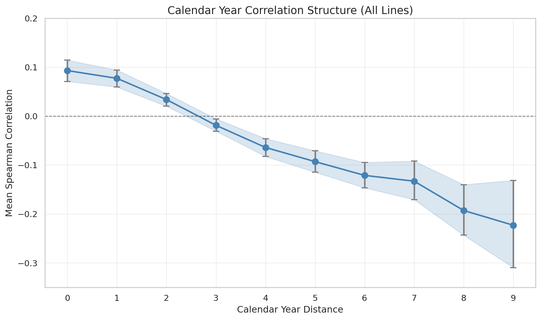 - Remains positive for adjacent calendar years (distance 1-2)