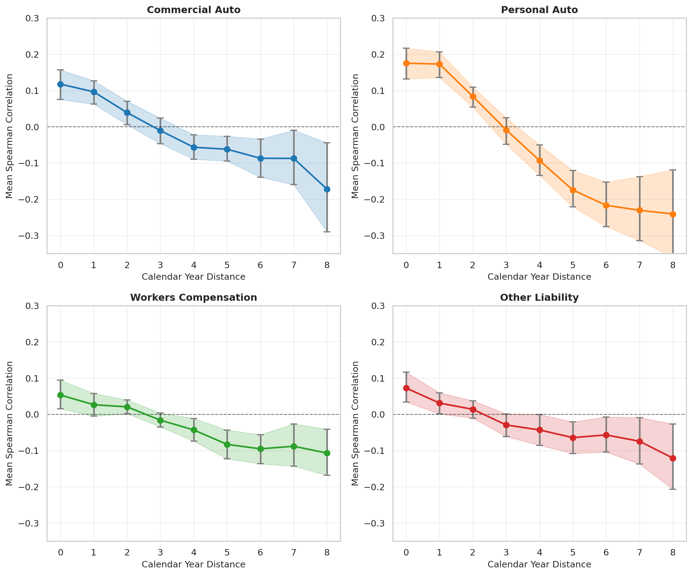 The magnitude of correlation varies by line. Personal Auto reserves may require stronger correlation assumptions (\(\rho \approx 0.17\)) than Workers Compensation (\(\rho \approx 0.05\)).