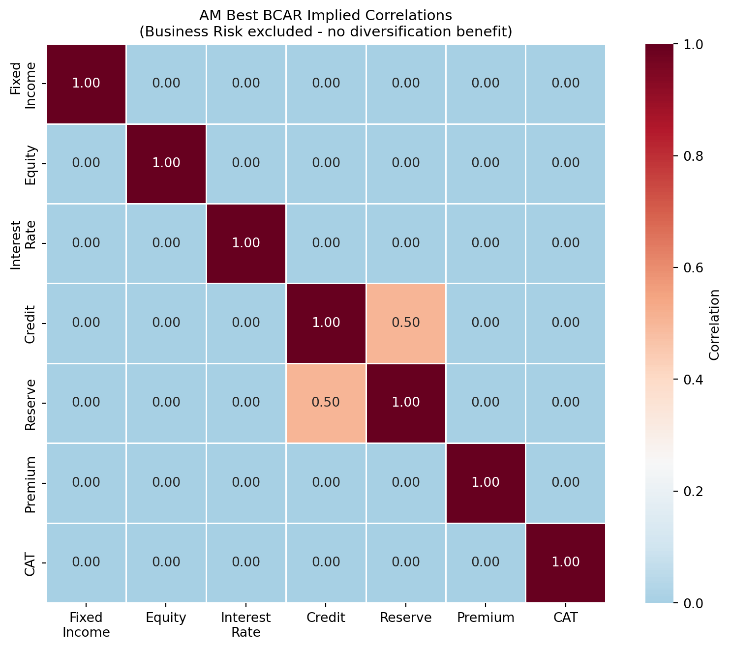 AM Best’s Best’s Capital Adequacy Ratio (BCAR) model uses a different approach, applying a covariance adjustment through a “square root rule” with explicit correlation between certain components: