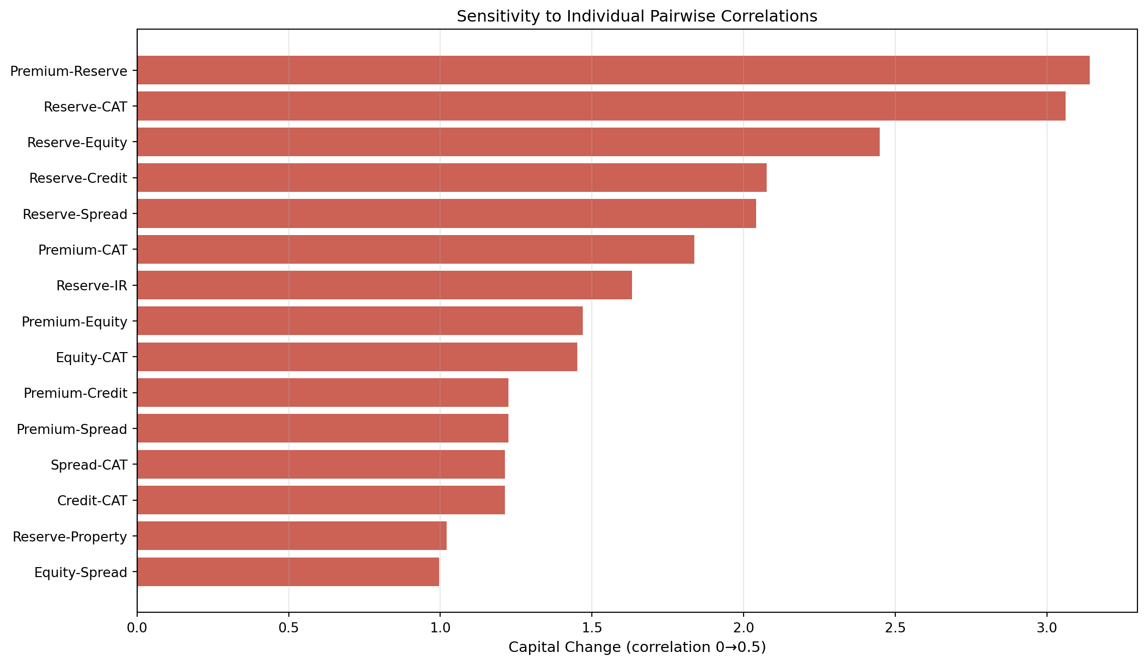 The analysis reveals that Reserve-Premium and Reserve-Credit correlations have the most significant capital impact, reflecting that reserve risk is often the largest standalone charge.
