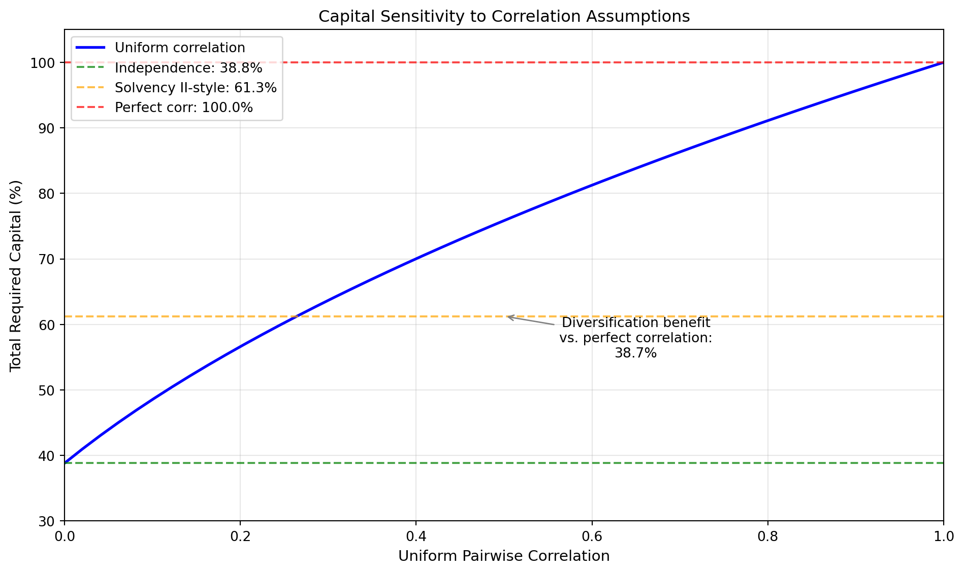 - Perfect independence (\(\rho = 0\)): Capital adds in quadrature: \(C_{\text{total}} = \sqrt{\sum_i C_i^2}\)
