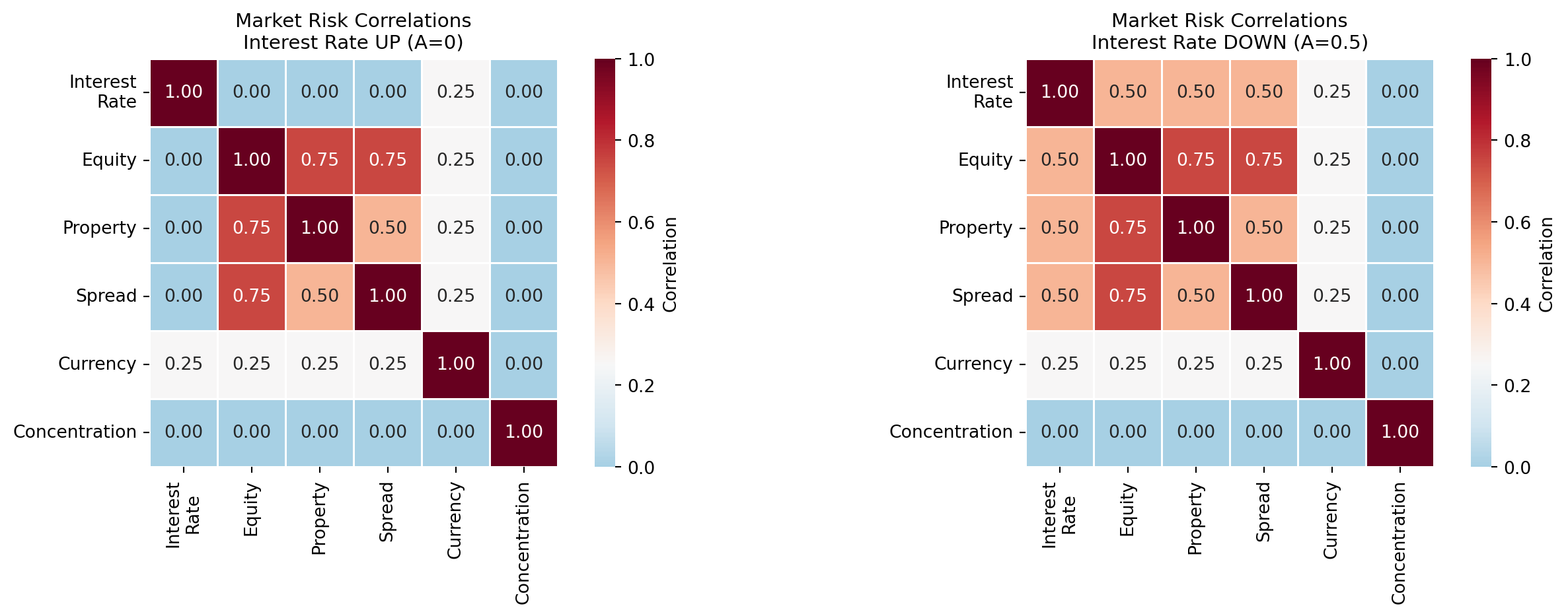 Within the Market risk module, Solvency II provides a more nuanced correlation structure that depends on the interest rate scenario: