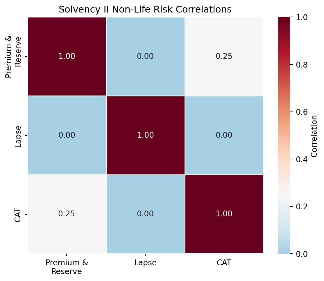 - Life and Non-Life have zero correlation: The regulation assumes life insurance and P&C underwriting risks are independent, reflecting their different exposure drivers