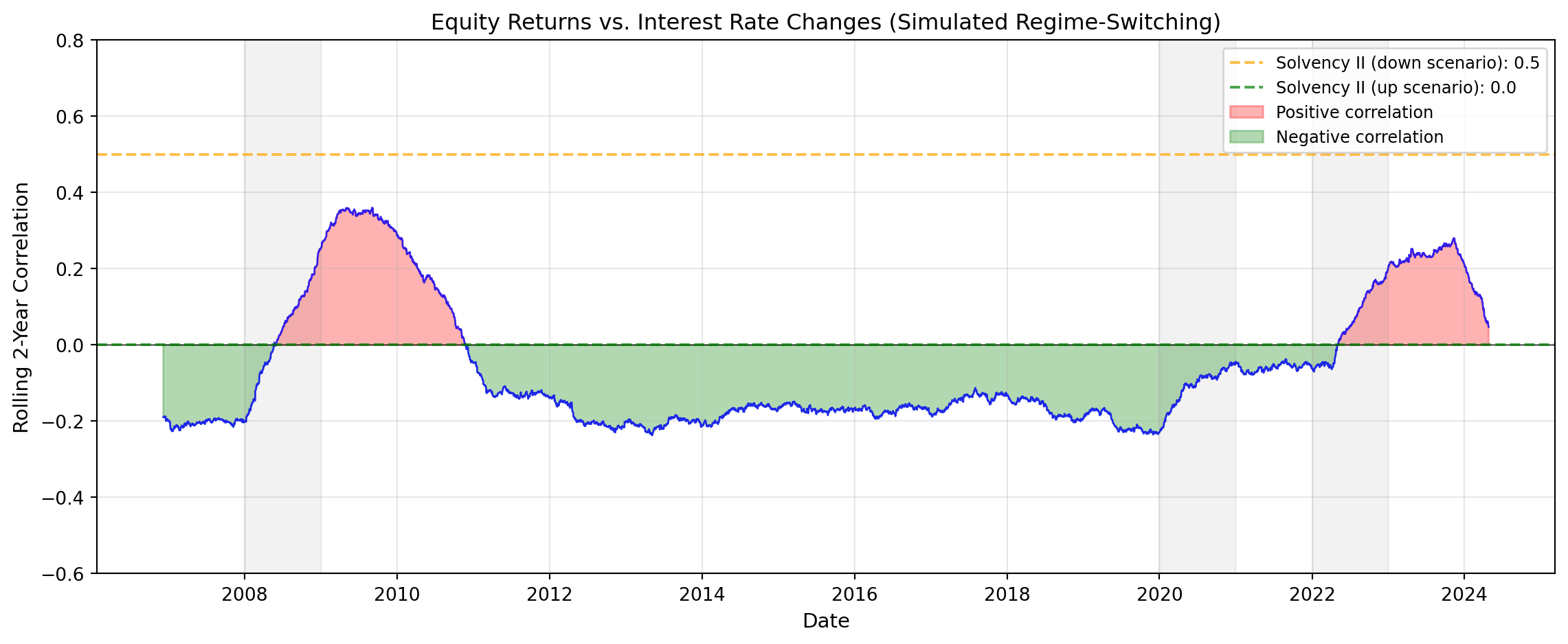 This simulation captures the key empirical observation: equity-rate correlations are regime-dependent. In normal markets, there’s often a negative correlation (rates up = equities up, reflecting economic growth). During crises, the correlation turns positive (rates down + equities down, reflecting flight-to-quality and risk-off dynamics). This justifies Solvency II’s scenario-dependent approach.