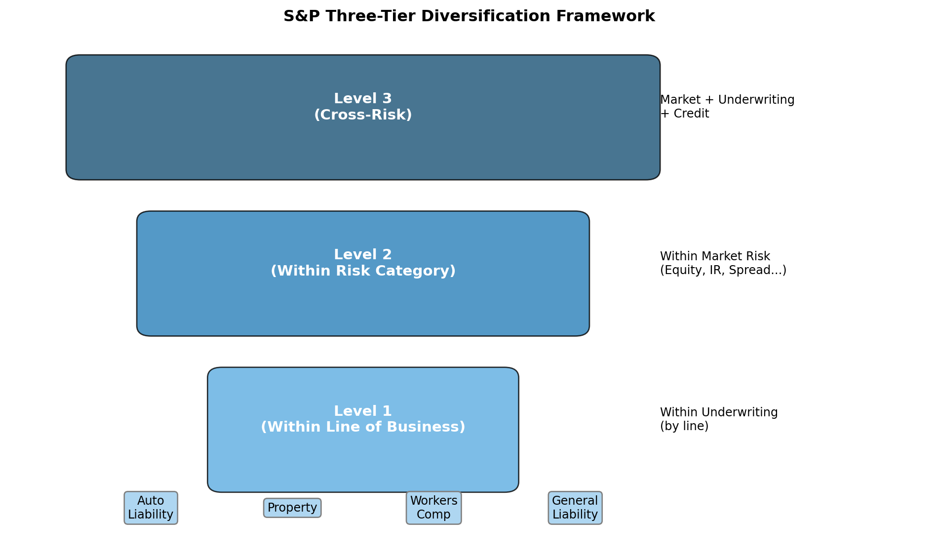- Level 2: Diversification within risk categories (market risk, underwriting risk, etc.)