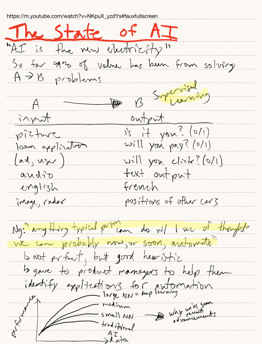Below are my notes from Andrew Ng’s talk, “The State of Artificial Intelligence”. See the YouTube video.